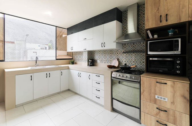 We preserved the essence of the kitchen by keeping the layout, the white furniture, veneering the tables and walls with ceramic tiles. We added touches of black.